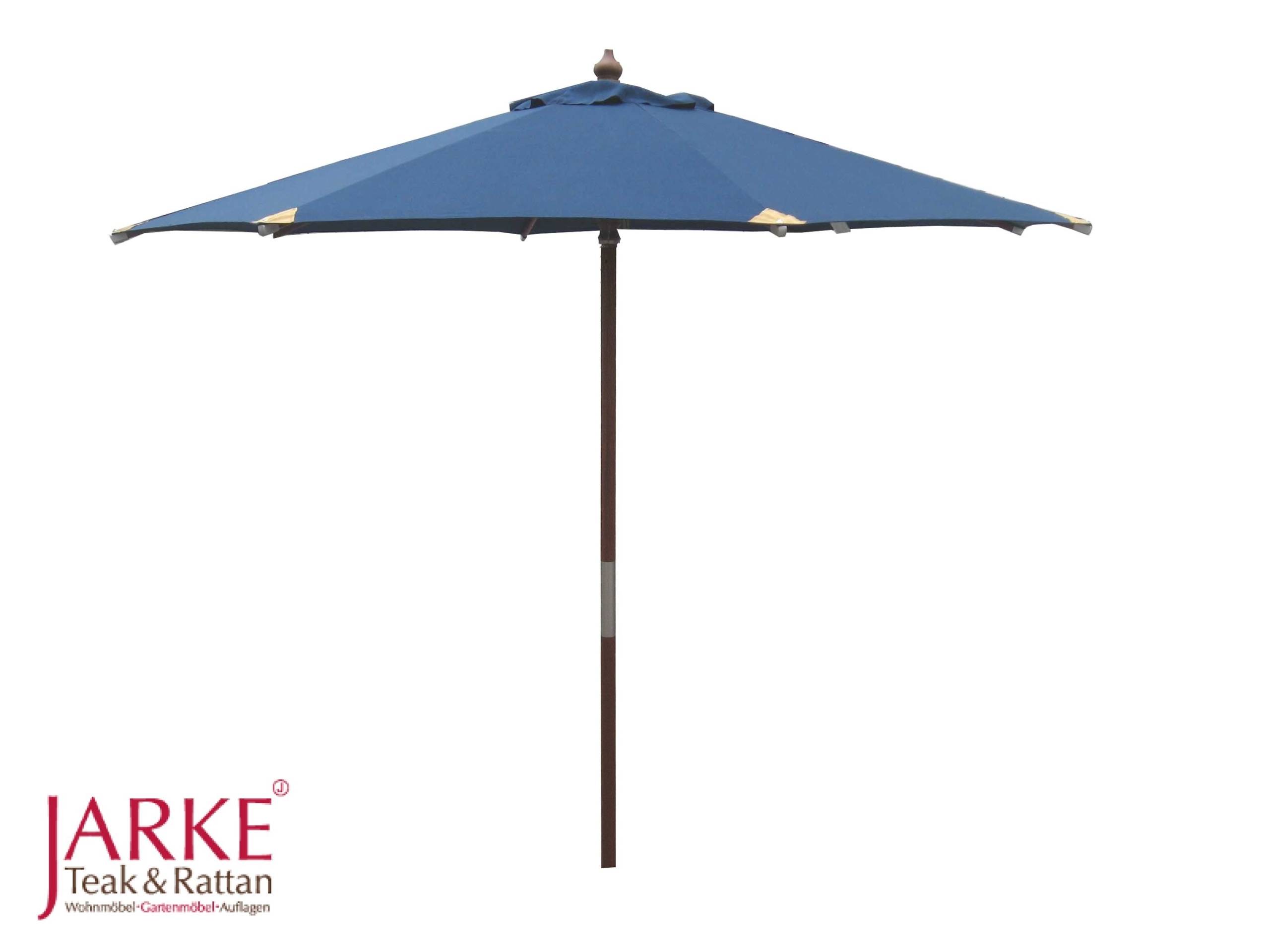 Die perfekte Größe für den kleinen Balkon: Runder Sonnenschirm 2,10 m aus Hartholz in der Farbe Dunkelblau, der dank „Press-Tilt“ geknickt werden kann. So kann der Schirm je nach Sonnenstand ausgerichtet werden. Praktisch in der Mittagshitze oder wenn gen Abend die Sonne tiefer steht.