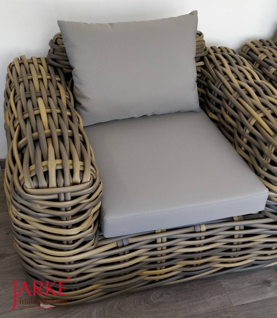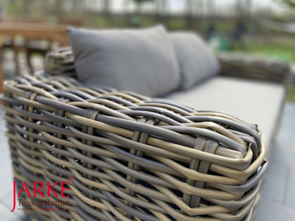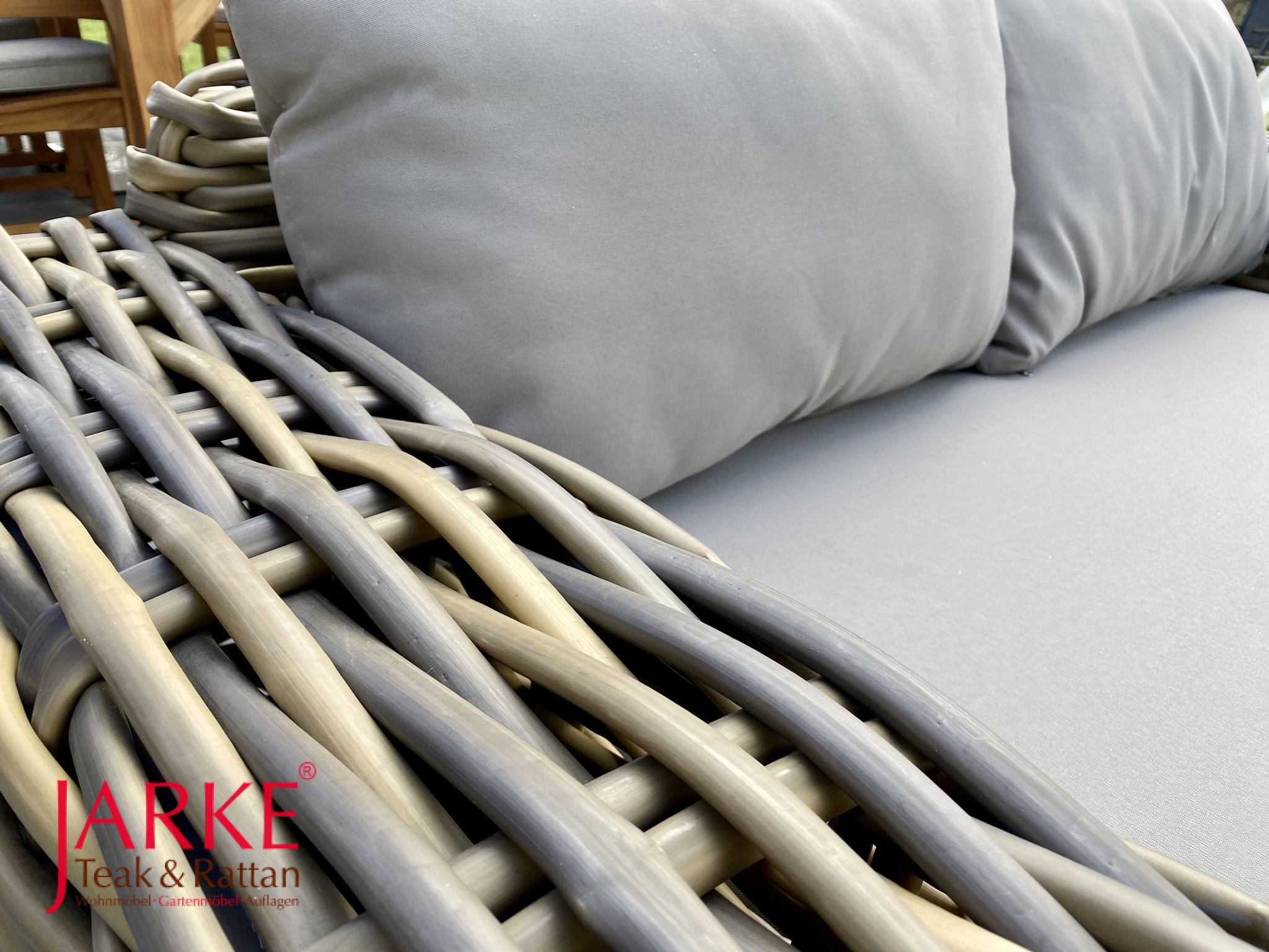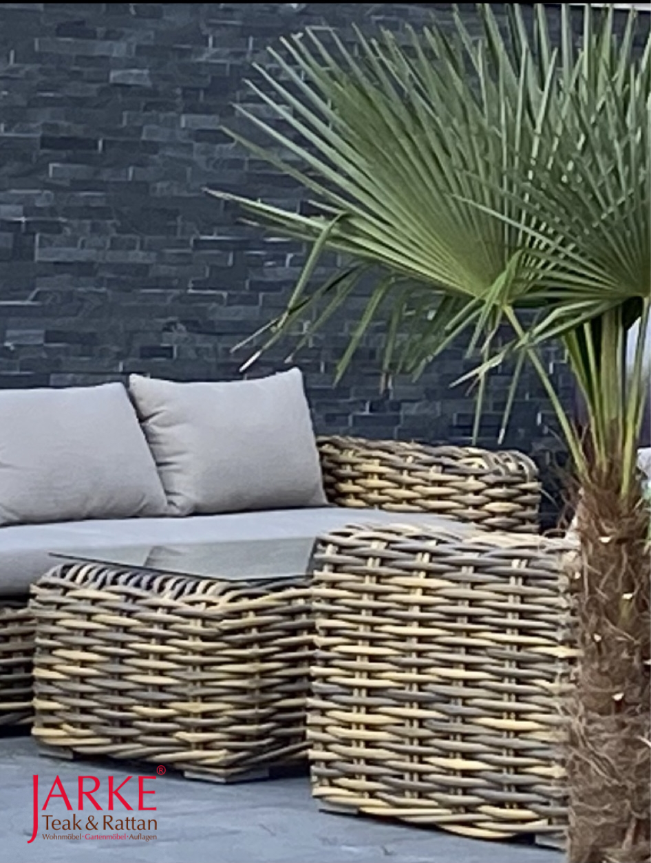 Neu und so noch nie da gewesen: Lounge-Gruppe „Mila“ – gefertigt aus wetterfester Kunststofffaser. Der Clou: die extra breite Faser von 18 mm hat den Look wie breites Rattan & Schilf. Extra breite Armlehnen von 25 cm runden den gemütlichen Look ab.