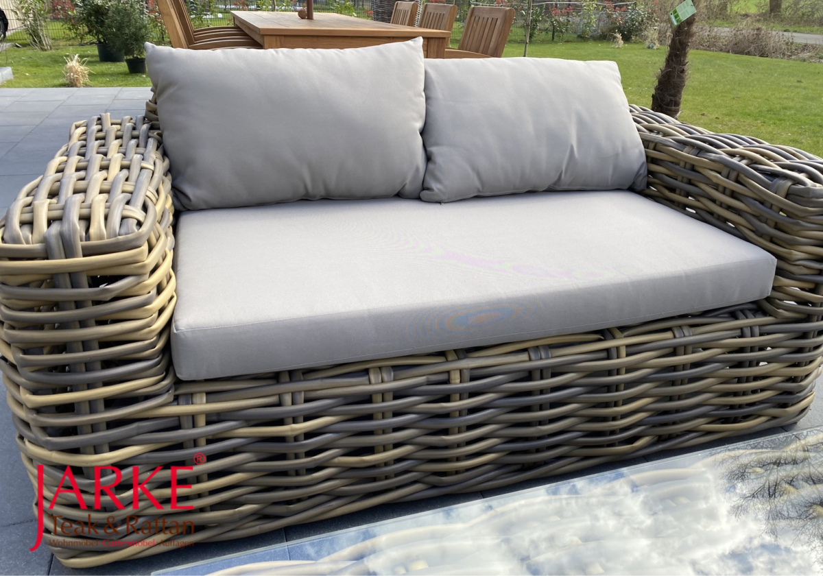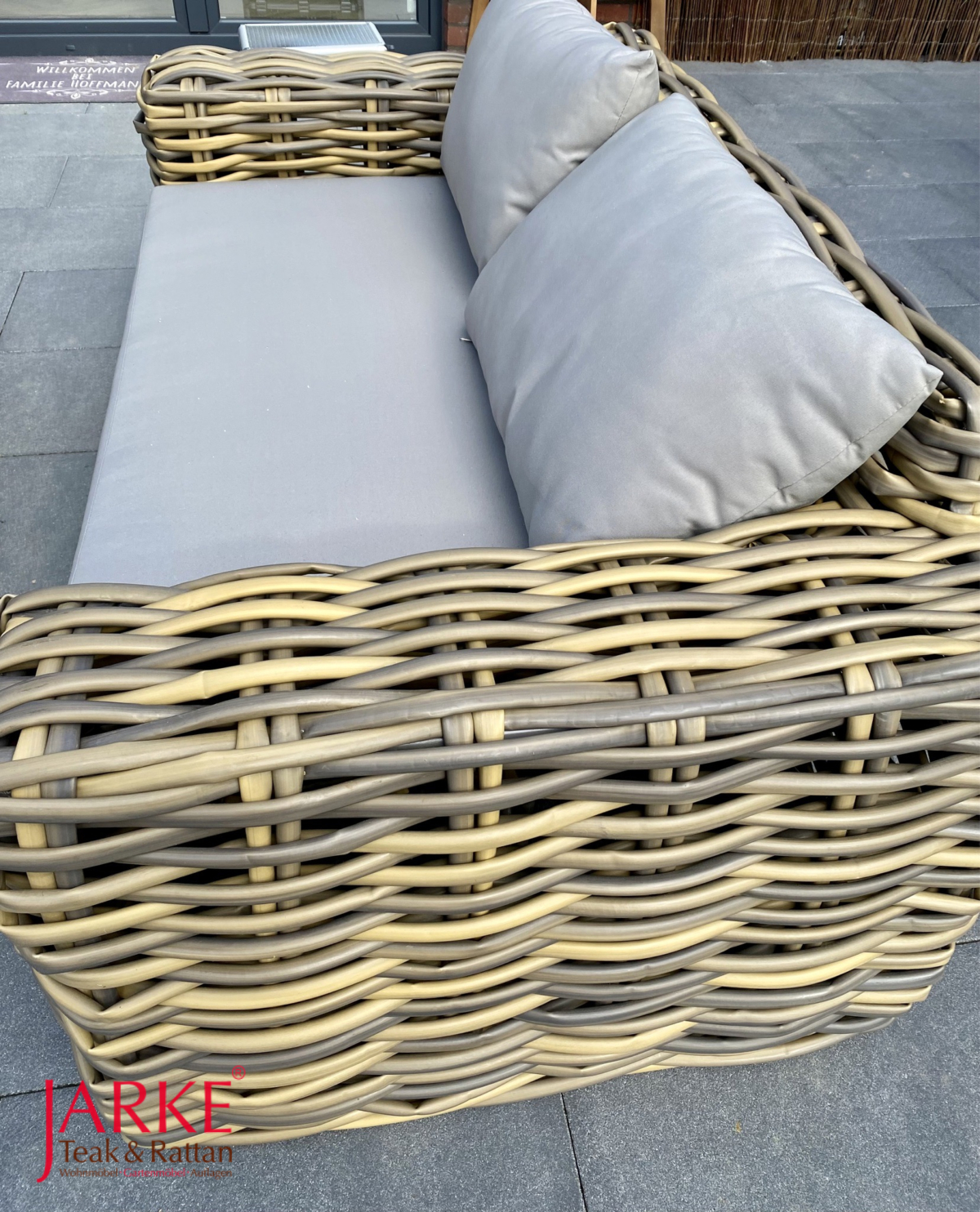 Toll die Farbe – ein Sand, Olive & Grauton, der in jedes Ambiente passt. Passend die waschbaren hellgrauen Polster. Diese können Sie bei jeder Witterung draußen lassen, dank des patentierten Schaumstoffes QuickDryFoam.