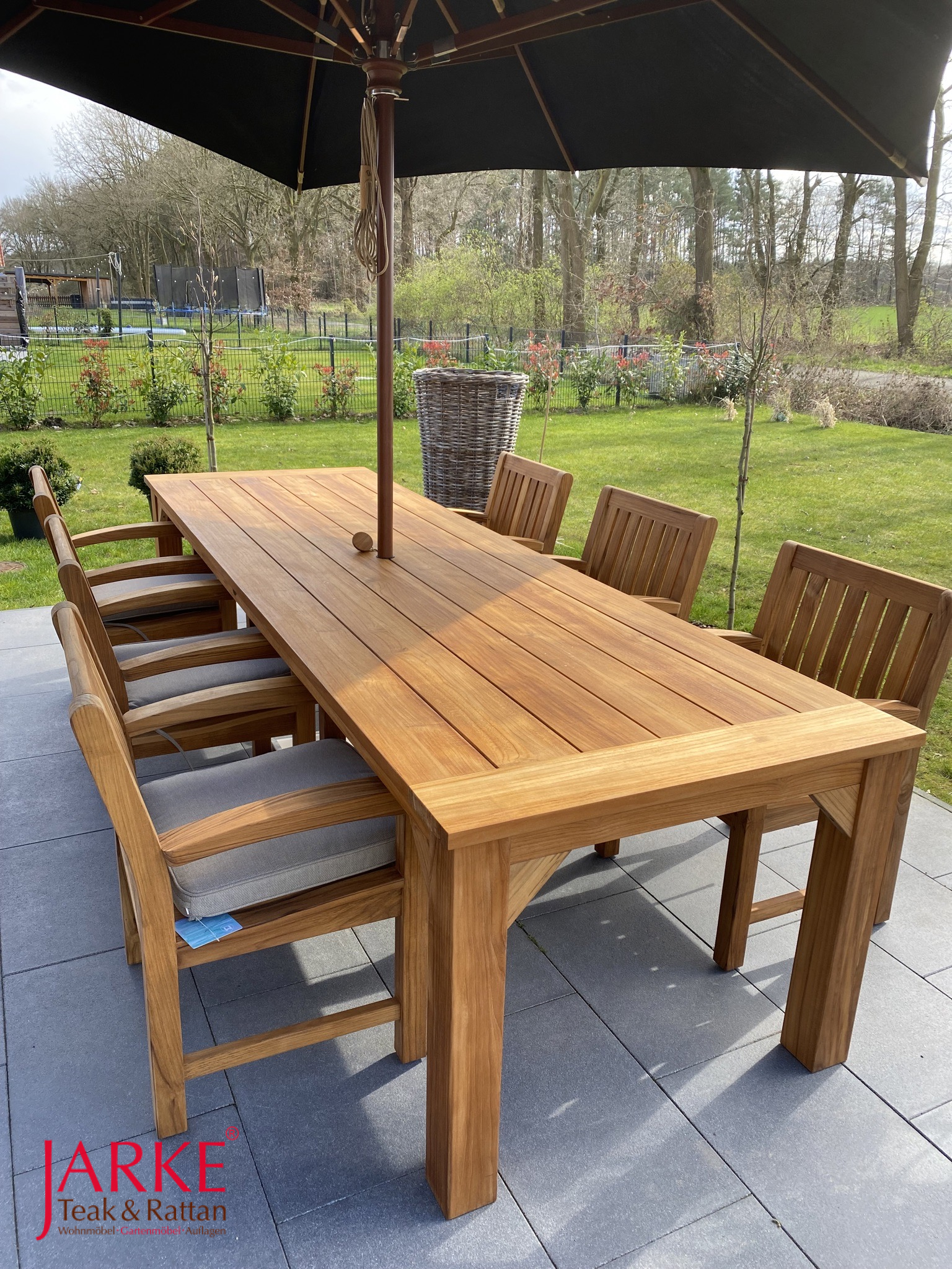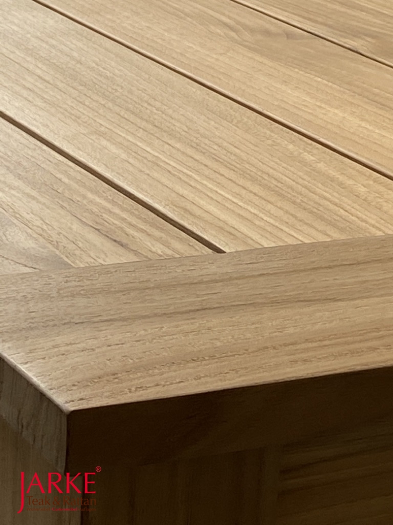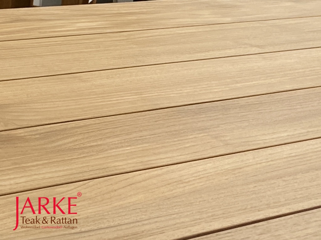 Jarke Premium – Wir verwenden ausschließlich das Kernholz mit höchster Dichte und absolut gleichmäßiger Maserung. Der extra Feinschliff sorgt dafür, dass sich das Holz samtweich anfasst. Zu gern streicht man mit den Händen über die Tischplatte. Wir verkaufen unbehandeltes, also nicht geöltes Teakholz, damit Sie die einzigartige Holzqualität sehen können.
