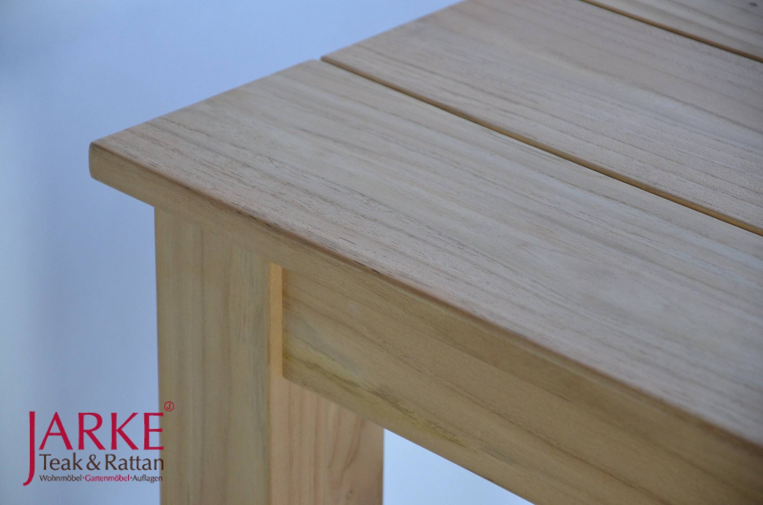 Dieser Tisch ist nicht nur ein Blickfang, sondern auch äußerst funktional und vielseitig einsetzbar. Die Tischplatte beeindruckt mit einer extra breiten Lattung von je 15 cm und sehr feinen Regenrillen. Die Beine des Tisches haben einen Durchmesser von 8 x 8 cm und können dank der Edelstahlverschraubung problemlos entfernt werden. Dies ermöglicht eine einfache Lagerung oder den Transport des Tisches, falls erforderlich.